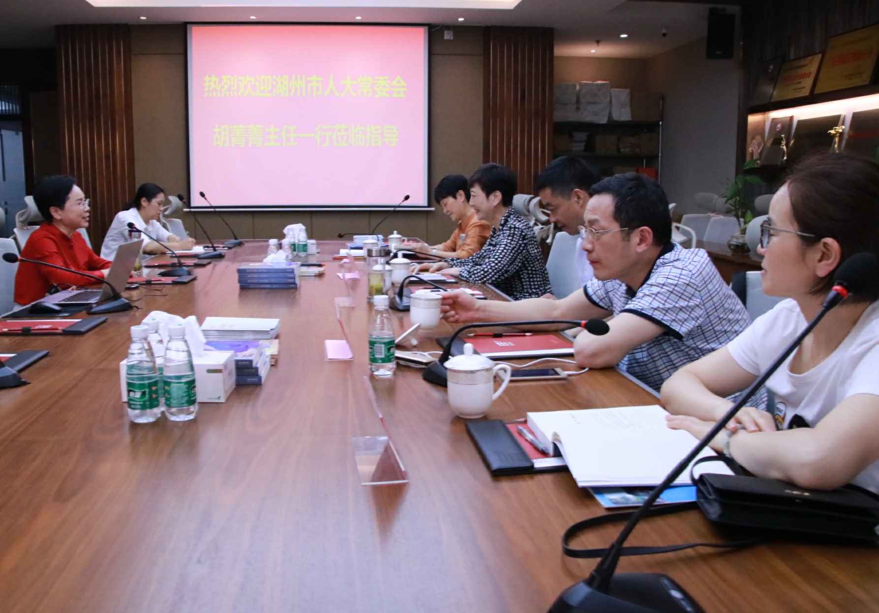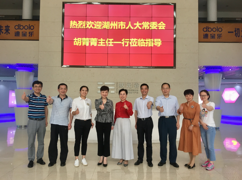 4月26日,湖州市人大常委会胡菁菁主任一行莅临米兰官方版网站登录入口-米兰online(中国)总部考察指导,集团董事长、广东省湖州商会会长官金仙热情接待了胡主任一行。